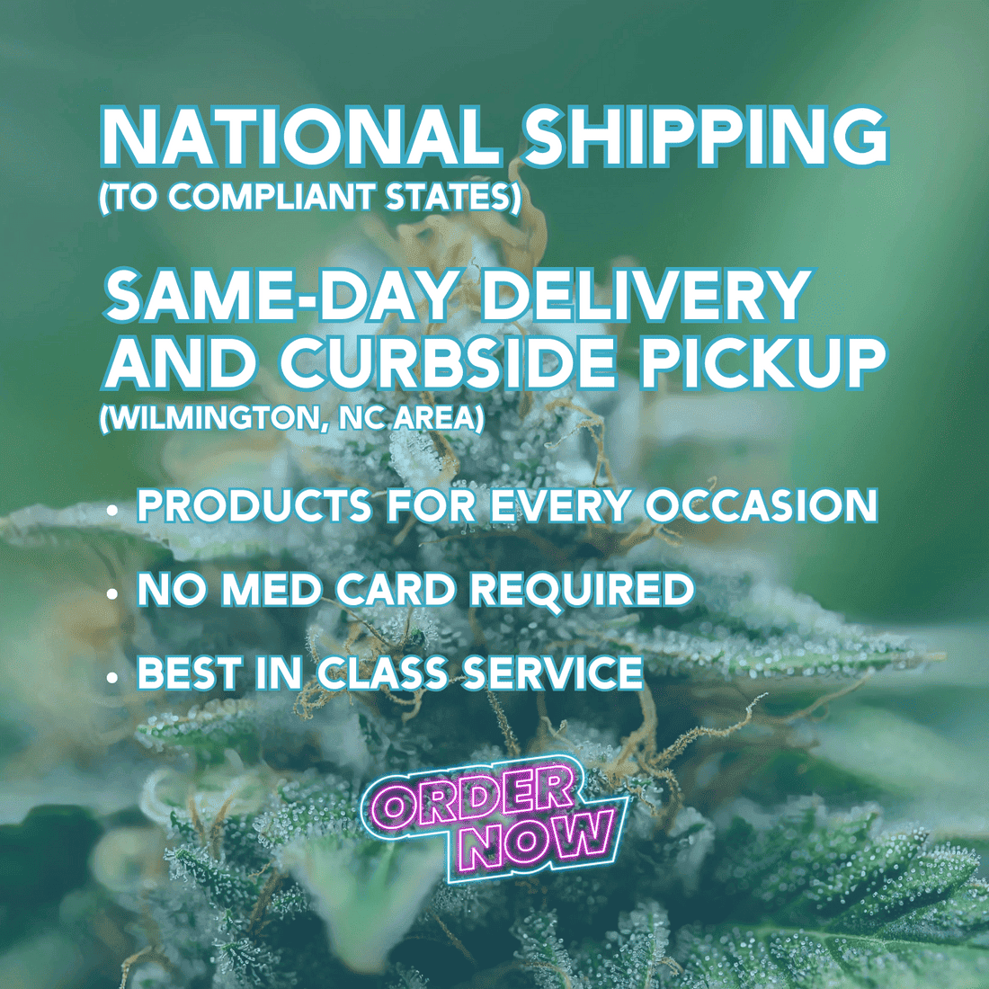 Now delivering premium hemp products same-day within a 15 mile radius including Wilmington, Leland, Carolina Beach, Wrightsville Beach, Castle Hayne, and more. Order online or reliable, same-day delivery, curbside pickup, or convenient nationwide shipping.