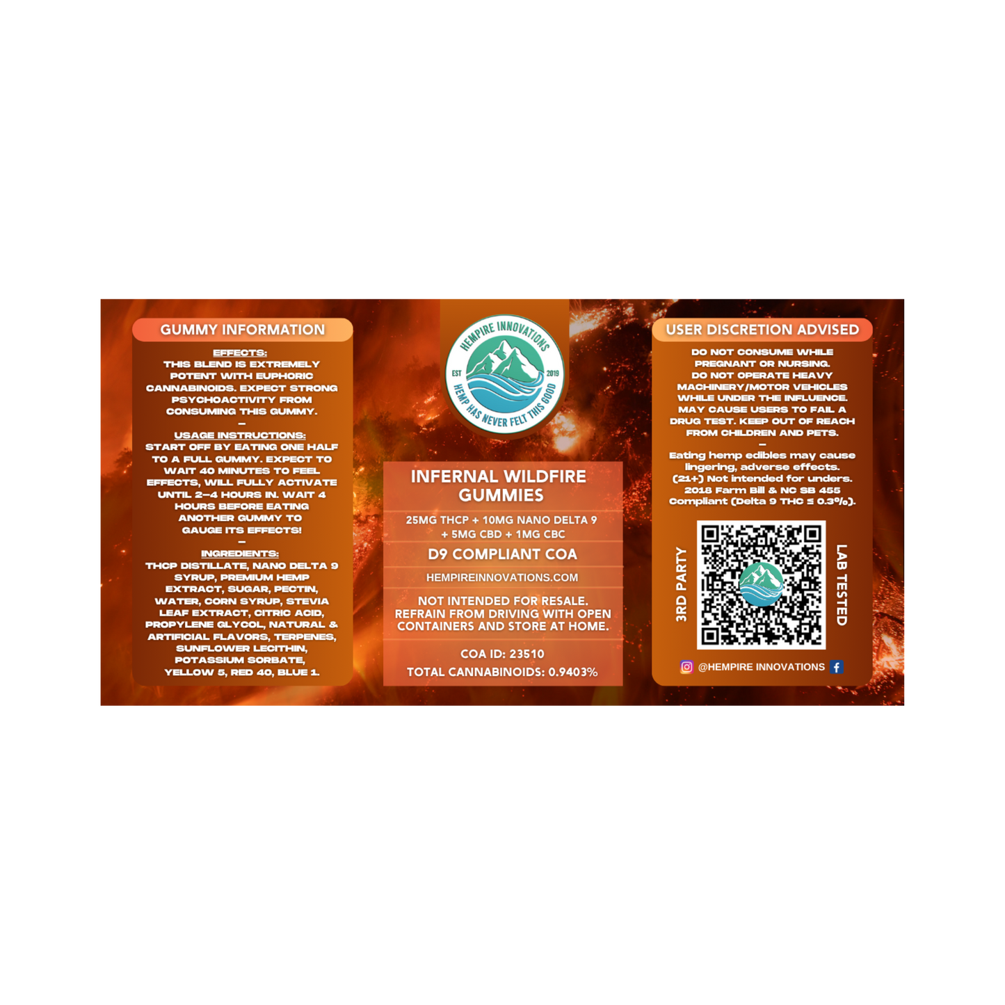 Ignite your senses with Infernal Wildfire—the audacious evolution of our signature Wildfire Blend. We've cranked the intensity past all limits, creating a daring formulation that shatters the ceiling of conventional potency. This isn't just double strength—it's a bold fusion of supercharged THCP and Delta 9 distillate crafted exclusively for thrill-seekers who demand the most explosive experience possible. Not for the faint-hearted.