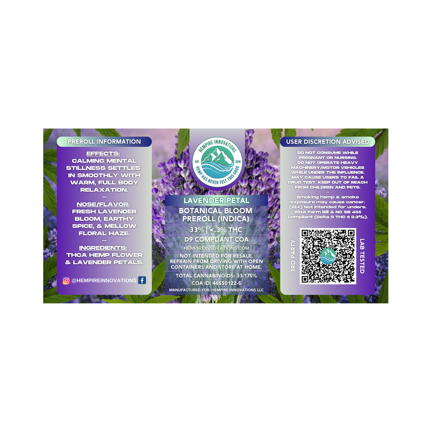 Lavender is an indica-dominant preroll crafted from relaxing, body-heavy flower infused with organic lavender buds. The blend softens the strain’s natural earthy base, adding a soothing floral layer that deepens physical comfort and quiets mental tension. This preroll is built for evening wind-down, gentle relaxation, and settling the body into a calmer rhythm.