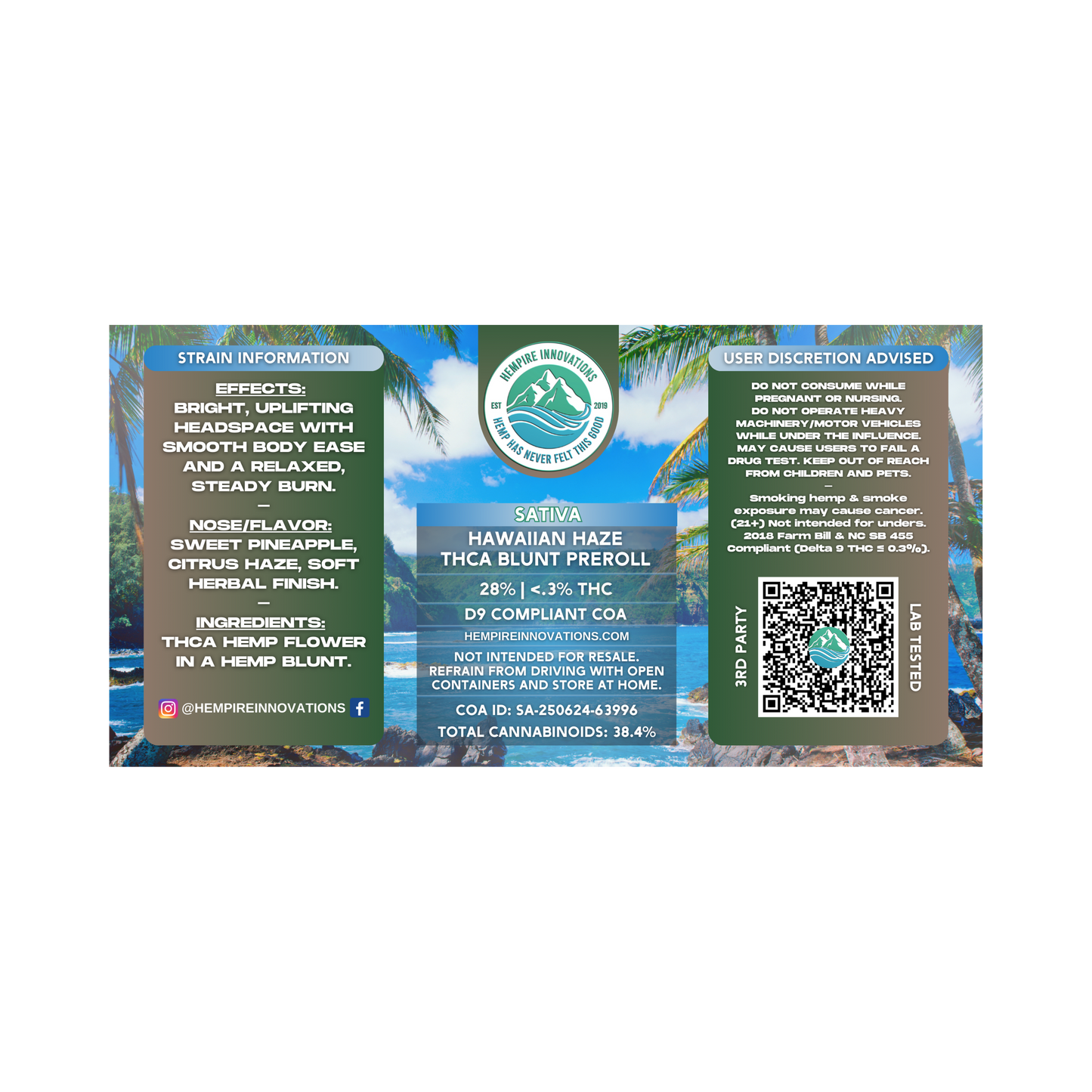Hawaiian Haze: a sativa-dominant cultivar, traditionally bred from Hawaiian landrace genetics and haze lineage. Known for its clear, upbeat effects, this strain leans energetic without becoming overwhelming. This THCa blunt preroll uses cannabis-derived terpenes to preserve the strain’s original tropical character, delivering a bright, clean experience designed for daytime flow and mood elevation.