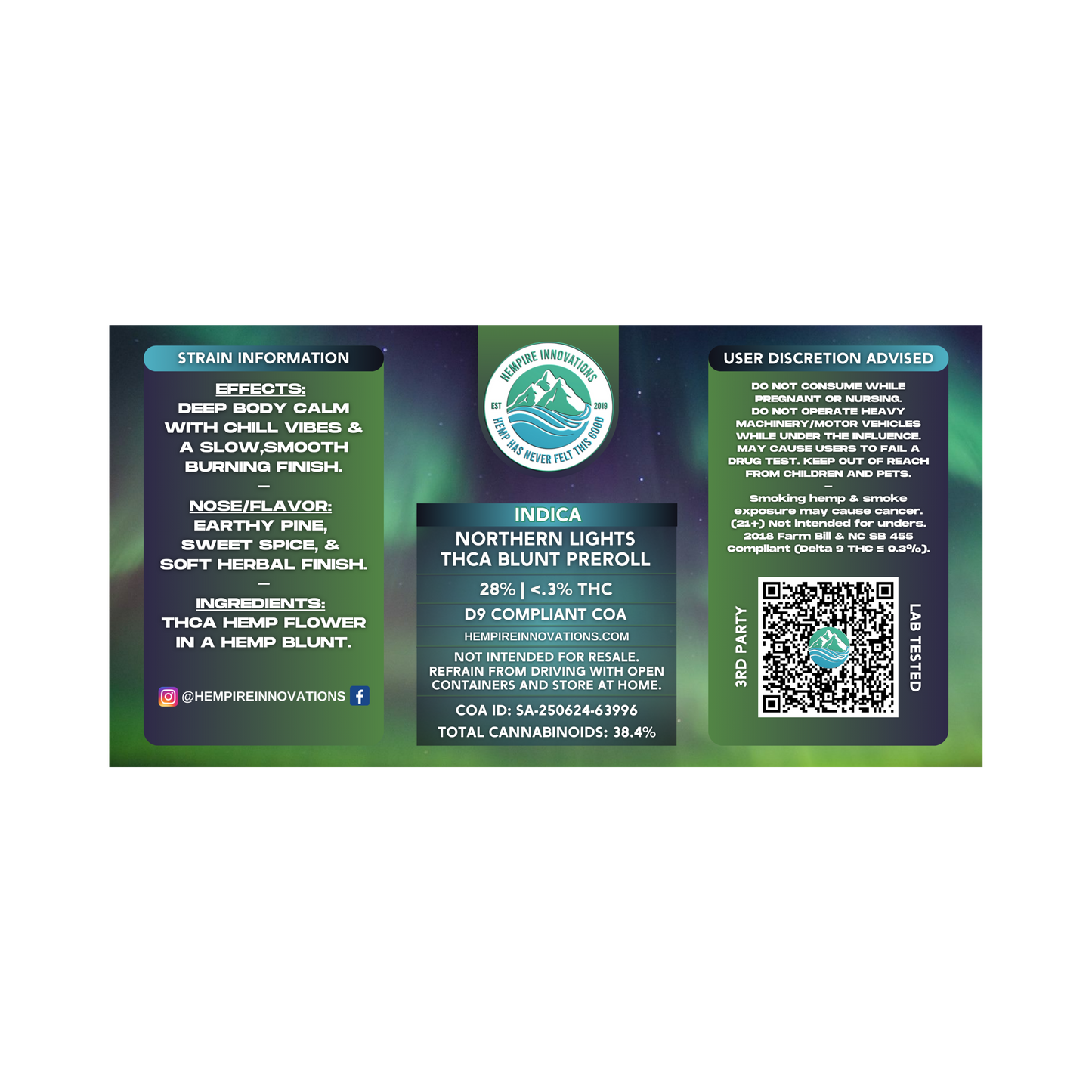 Northern Lights: an indica-dominant cultivar, originally bred from Afghani landrace genetics and refined through classic indica selections. Revered for its deeply relaxing character, this THCa blunt preroll uses cannabis-derived terpenes to preserve the strain’s original profile, delivering a mellow, grounding experience designed for evening unwind and full-body relaxation.