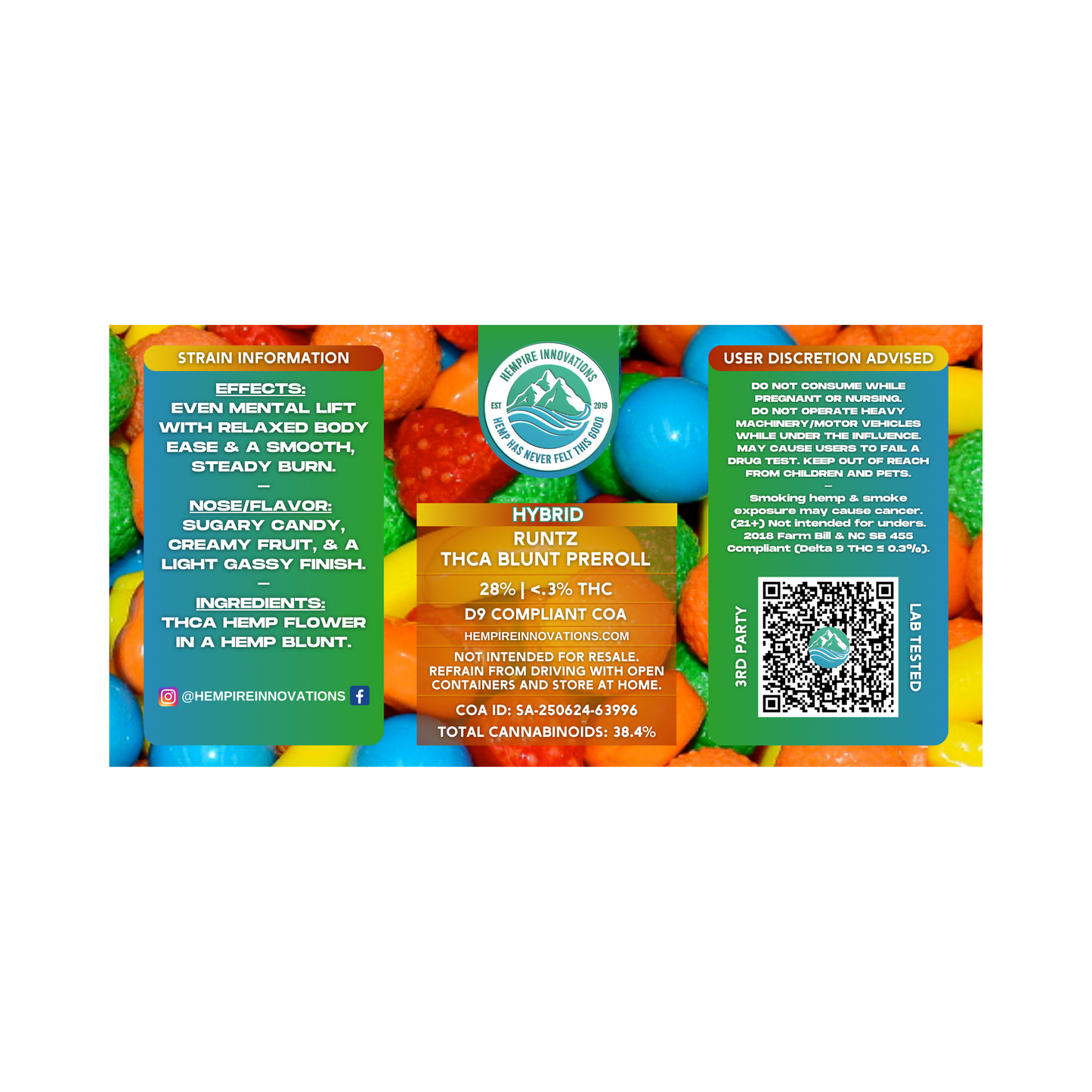 Runtz: a hybrid cultivar, bred from Zkittlez and Gelato, two flavor-forward genetics known for balanced effects and rich terpene profiles. This THCa blunt preroll uses cannabis-derived terpenes to preserve the strain’s original candy-sweet character, delivering a mellow yet expressive experience designed for anytime ease and mood elevation.