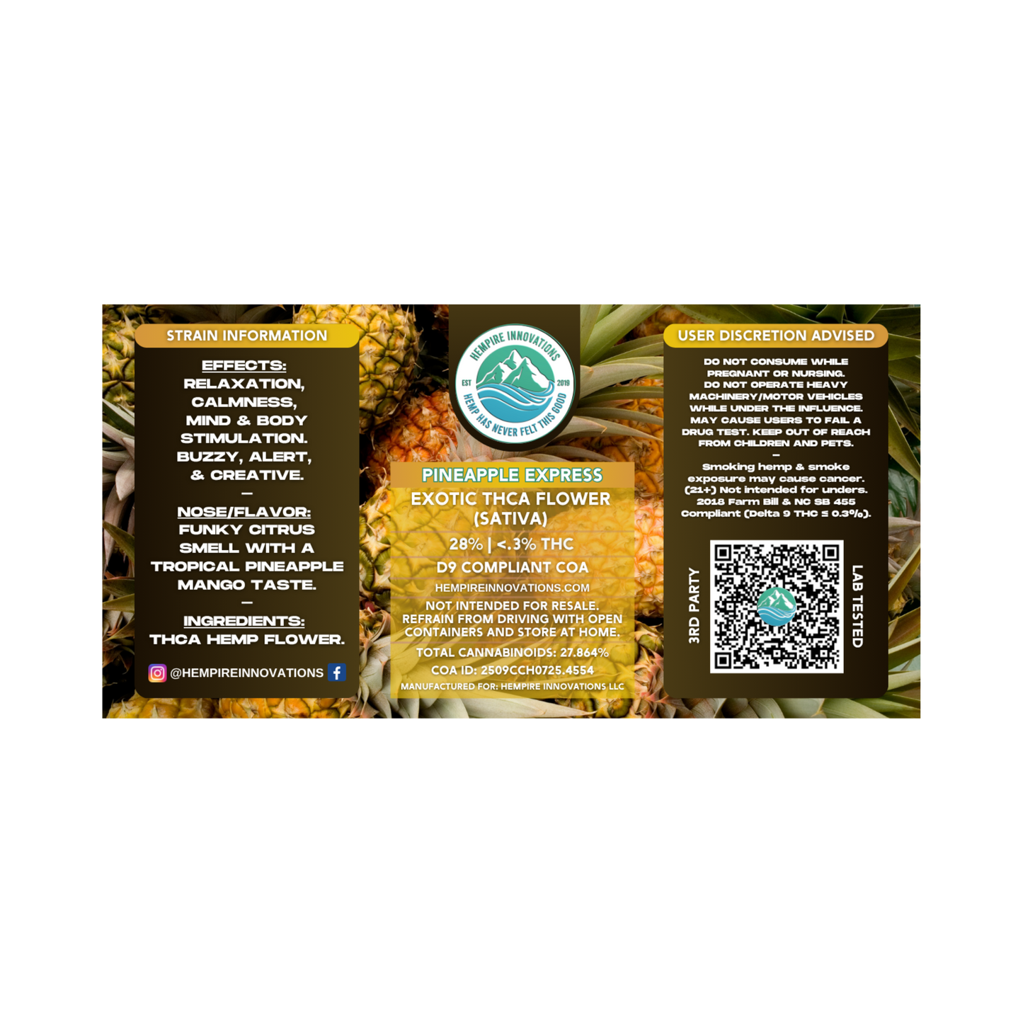 Pineapple Express is a sativa‑dominant hybrid cultivar, bred from Trainwreck and Hawaiian. With a 60/40 sativa‑to‑indica balance, it delivers a bright, bold experience tailored for daytime flow, creative focus, and mood lift. This strain features a standout aroma of juicy pineapple and fresh citrus, layered with subtle pine and earth. The flavor mirrors the aroma with ripe tropical fruit, citrus punch, and a crisp piney finish.